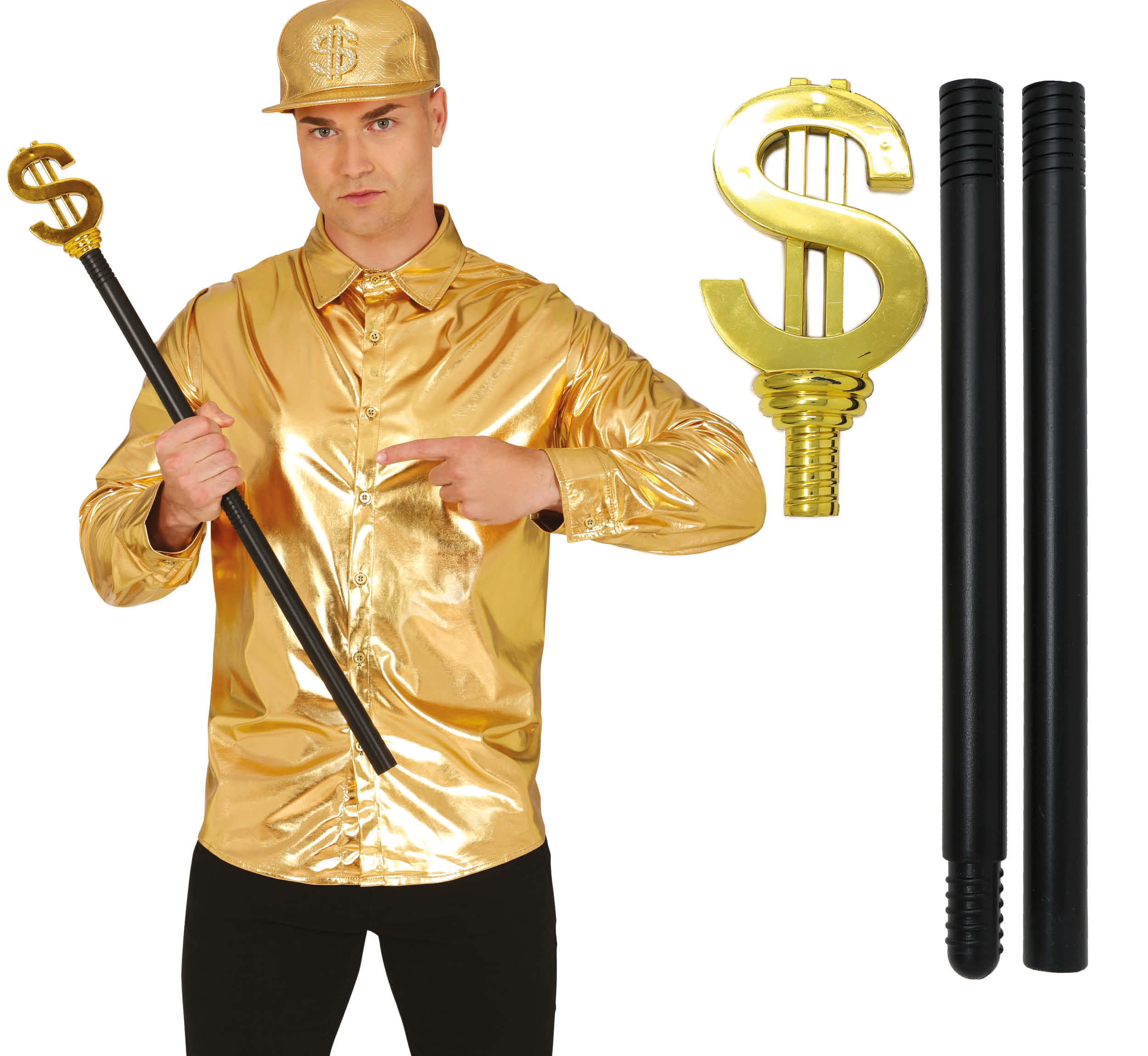 - DIVENTA IL RE DEL BLING! – Include il bastone smontabile con il simbolo del dollaro. Non include la camicia, il cappellino né altri accessori. Perfetto per farsi notare a qualsiasi festa anni ’90!