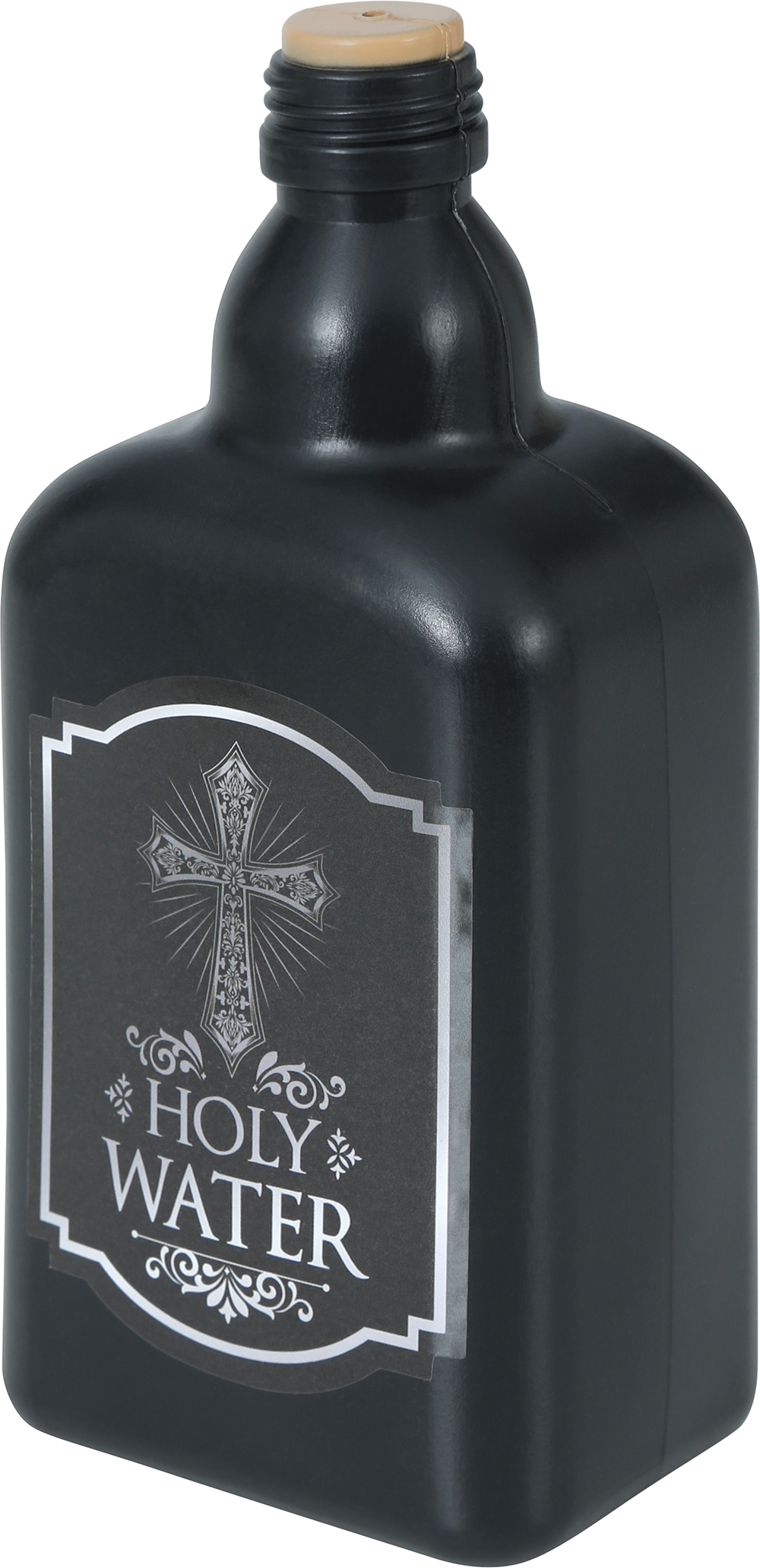 Una bottiglia di acqua benedetta realizzata in plastica di qualità. La bottiglia è vuota e non può essere riempita, in quanto il tappo è un tutt’uno con la bottiglia e non si può togliere. Perfetta come accessorio ad Halloween per travestirsi da prete esorcista o prete zombie. La bottiglia ha un’altezza di cm 18. La plastica è di colore nero ed è presente un’etichetta con disegnata una croce e la frase Holy Water.