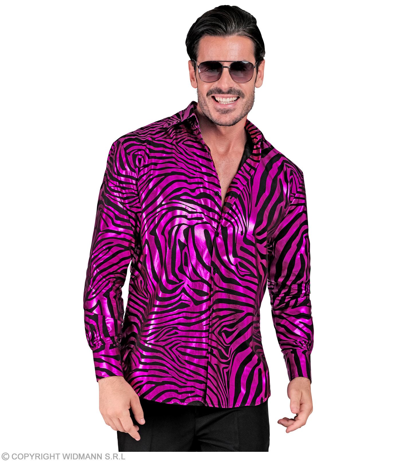 - La camicia da uomo è disegnata in un colore rosa lucido e decorata con strisce zebrate nere