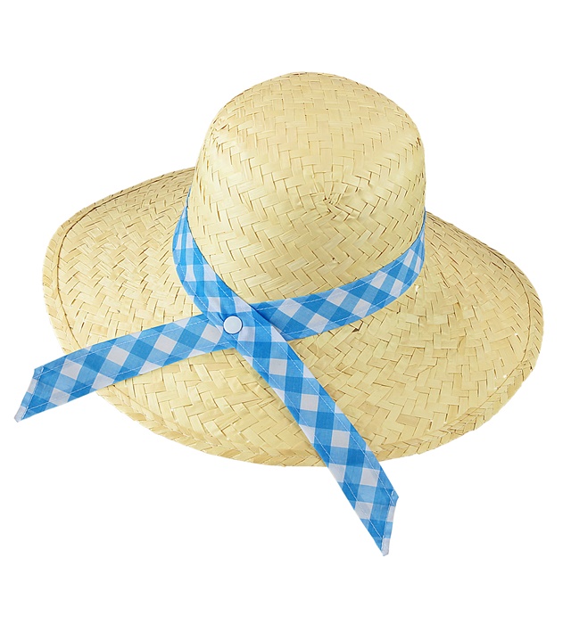 - Questo cappello di paglia è decorato con un nastro a quadretti bianchi e blu