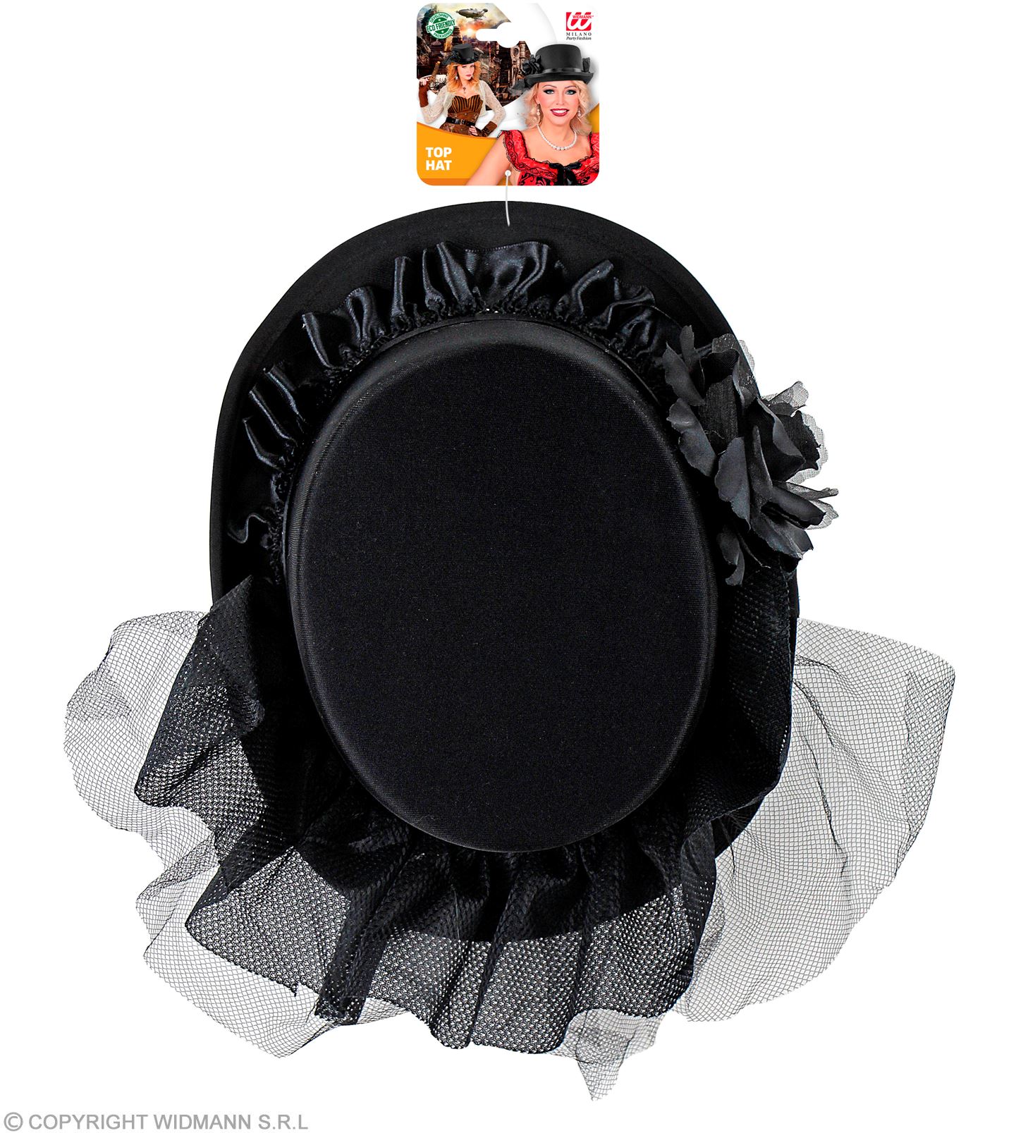 Cappello Cilindro con rosa nera in feltro nero.