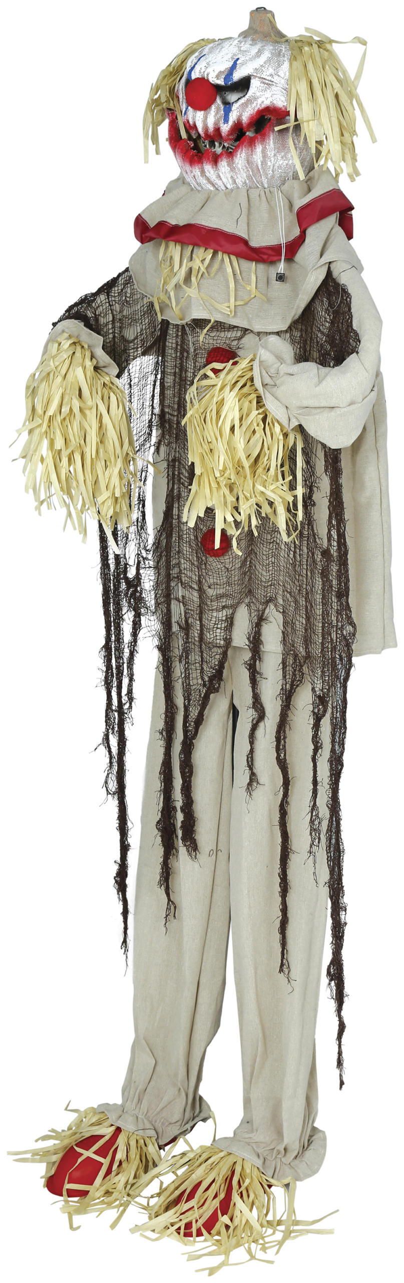 - COSTUME DA CLOWN SPAVENTAPASSERI CON LUCI E MOVIMENTO – Ideale per Halloween. Realizzato in metallo, poliestere e PVC. Colore beige per un tocco inquietante.