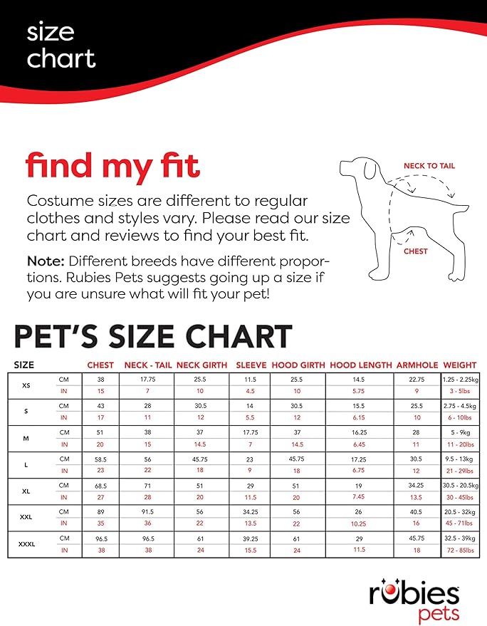 - IMPORTANTE! Non tutti i costumi si adattano a tutti gli animali domestici, si consideri lo stile del costume e la taglia degli animali; questo costume non ha spazio extra intorno al petto e alla pancia