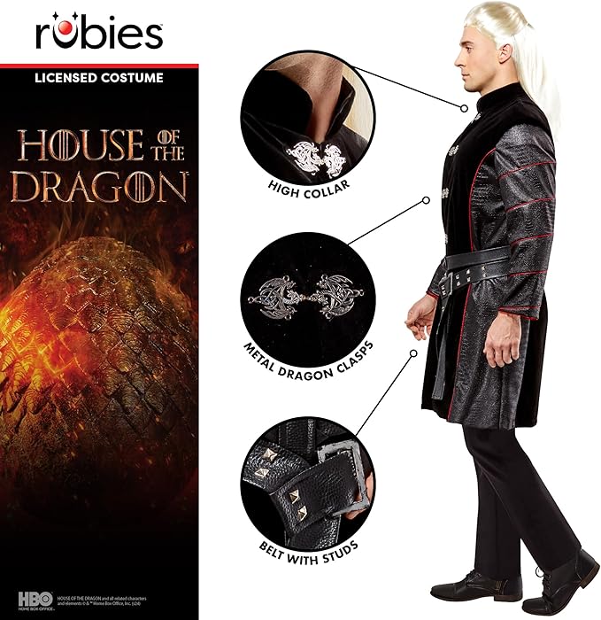 Le prove del regno non finiscono mai. Potrebbe sembrare così a Daemon Targaryen, ma è il tipo di uomo che sarà sempre in grado di affrontare qualsiasi sfida. È avventato, arrogante, feroce e coraggioso e ama risolvere i conflitti con una dimostrazione di forza. Tuttavia, ci sono molte persone che ama, tra cui suo fratello, Rhaenyra, e i suoi figli. Se hai voglia di mostrare il tuo potere questo Halloween, puoi indossare il costume deluxe da uomo di Daemon Targaryen della Casa dei Draghi, un costume che ti aiuta ad assomigliare proprio a questo personaggio di “House of Dragons”. Viene fornito con un lungo cappotto fedele all’originale e un set di cinture, l’inizio perfetto per un look incredibile. Aggiungi i tuoi dettagli, come una parrucca di Daemon, le calzature adatte, armi di scena e altro ancora per dominare la tua prossima festa in maschera. Per prenderti cura del costume, lavalo a mano con acqua fredda e detersivo delicato, asciugalo all’aria. Non candeggiare. Non stirare.