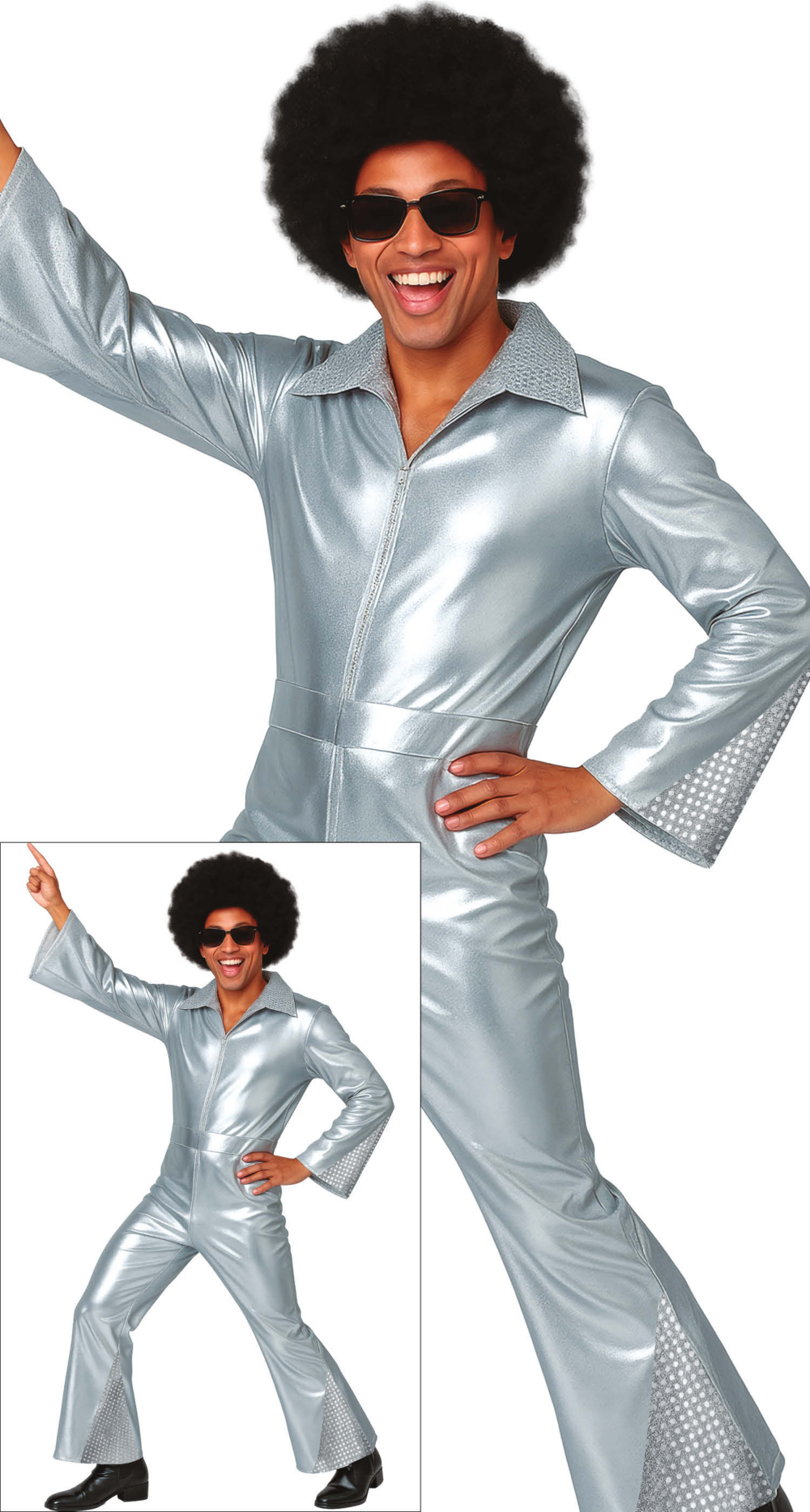 - BRILLA SULLA PISTA DA BALLO! – Include la tuta argentata e la cintura. Non include gli occhiali, la parrucca né le scarpe. Preparati a brillare a qualsiasi festa!