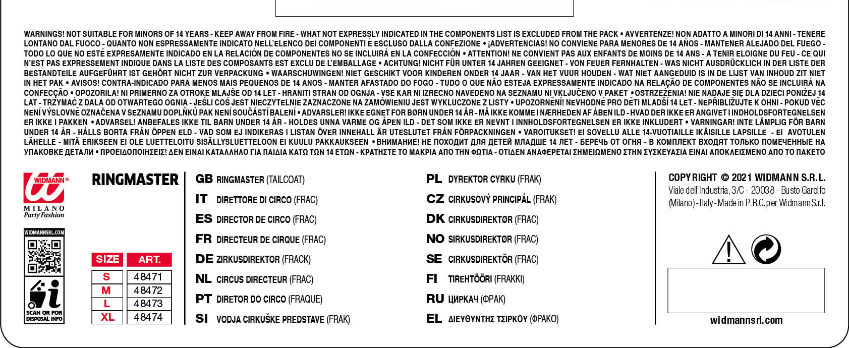 - Il costume è disponibile nella taglia M. Completa il cappotto Widmann con accessori accattivanti (non inclusi) per completare il tuo outfit da festa