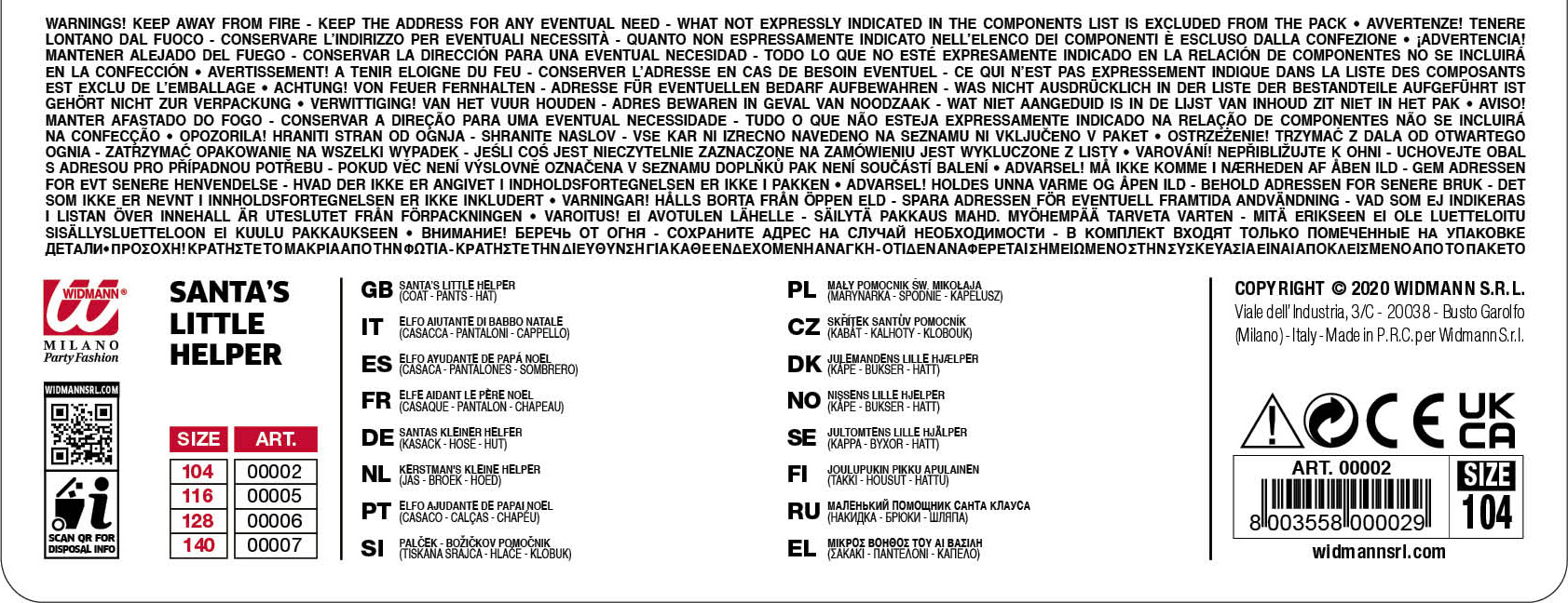| Taglia | 2 – 3 anni 104 H, 4 – 5 anni 116 H, 5 – 7 anni 128 H, 8 – 10 anni 140 H |