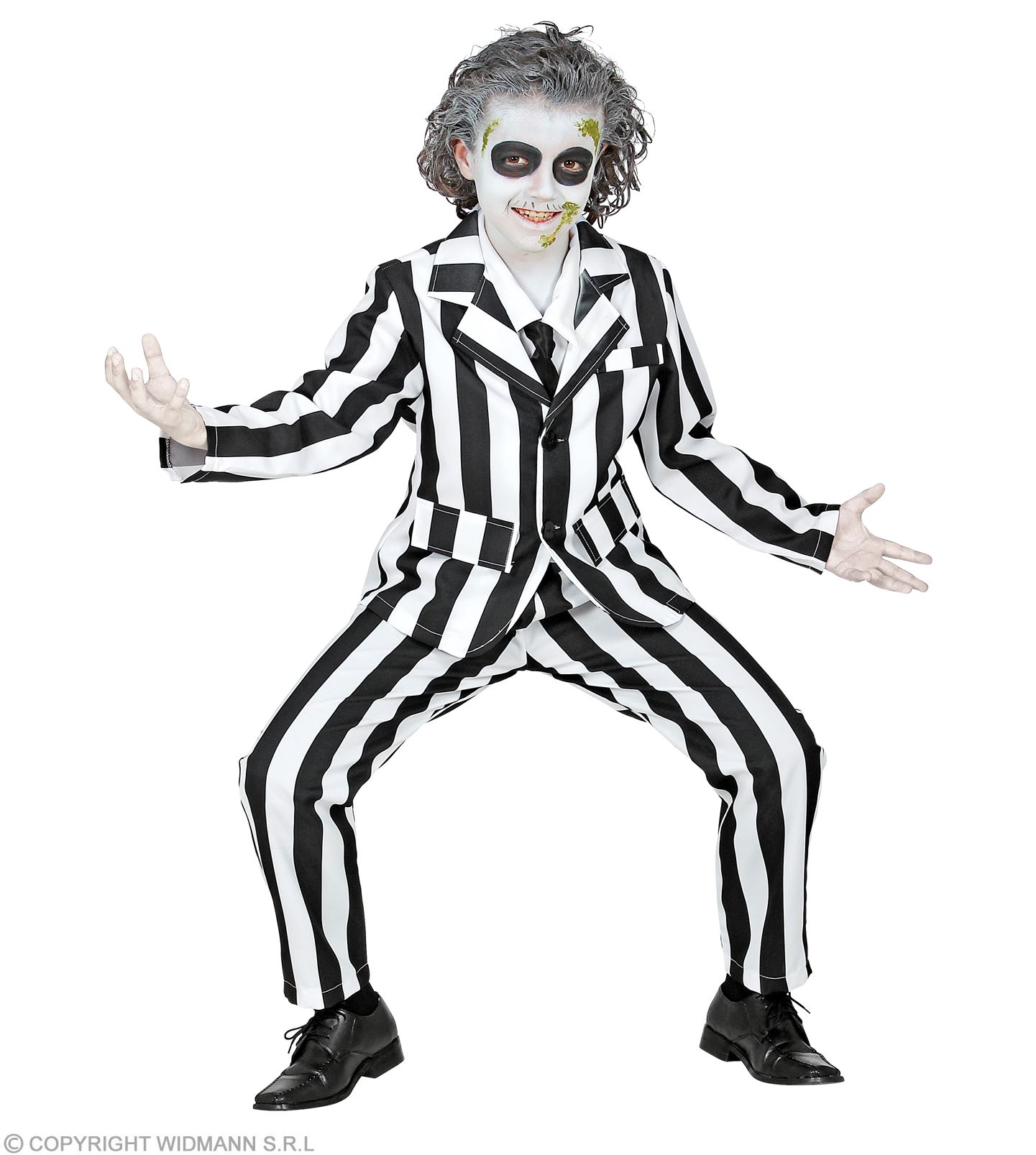 Questo costume è composto da pantaloni e giacca abbinata. La giacca e i pantaloni sono a righe bianche e nere. La giacca si chiude con due bottoni neri. La giacca ha anche 3 false tasche. Il costume viene fornito con una cravatta nera per completare il look.Informazioni aggiuntive