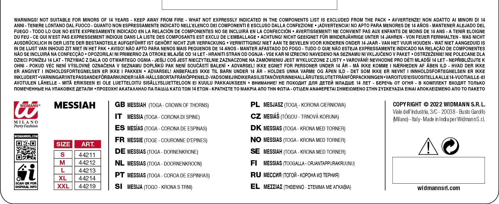 La confezione comprende: tunica, toga, corona di spine. Sono esclusi gli accessori non menzionati.