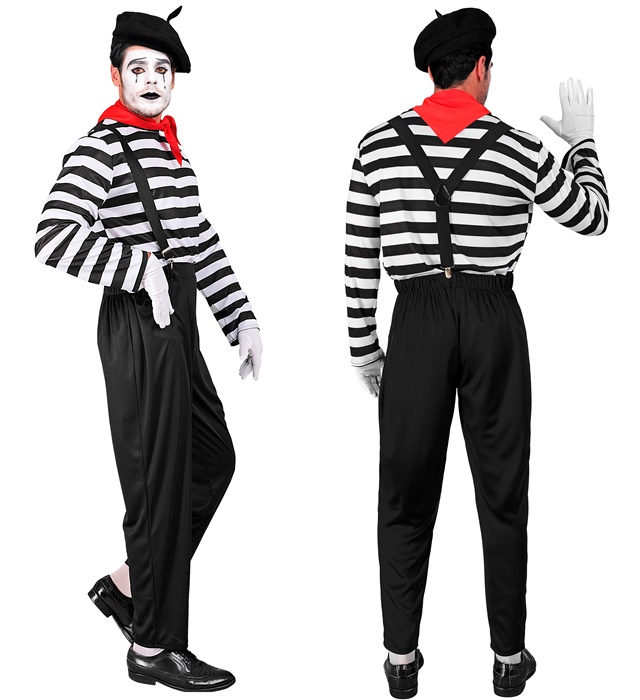 - Look classico da mimo: con maglia a righe, pantaloni neri, bretelle, guanti, foulard e berretto si crea un outfit intramontabile nel tipico stile da mimo