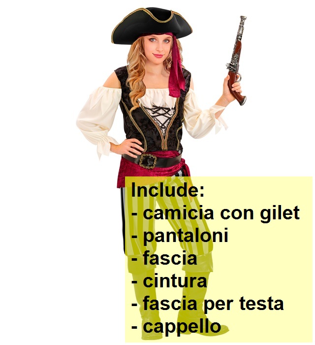 • Costume da pirata completo: con camicetta, gilet, pantaloni, cintura, fascia, cerchietto e cappello, c’è tutto il necessario per diventare subito una piccola bucaniere, senza dover cercare a lungo i singoli pezzi