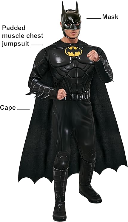 - Include: Tuta con petto muscoloso imbottito e copri-stivali, mantello, guanti e maschera