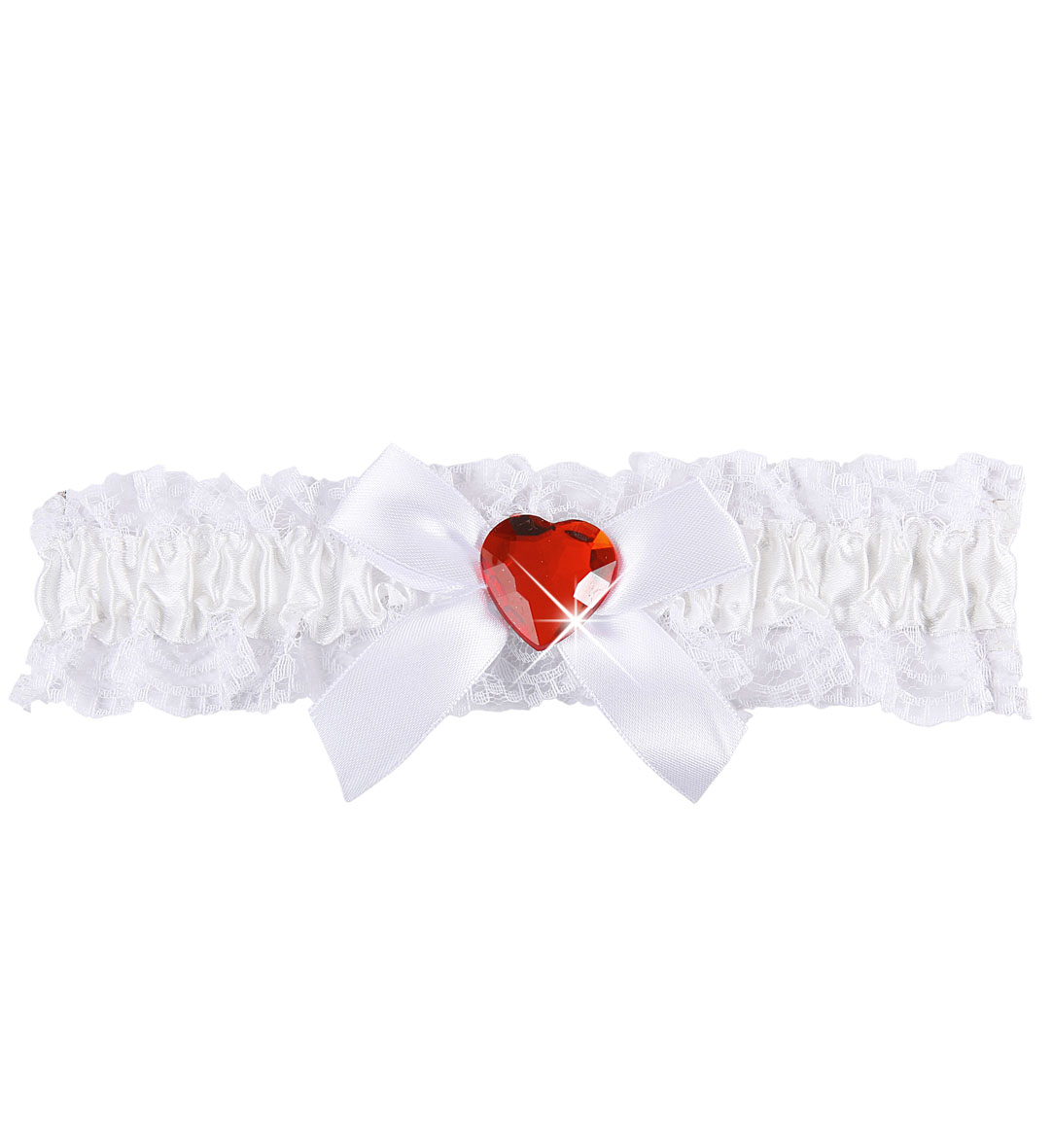 Questa giarrettiera e di colore bianco in pizzo con una gemma rossa a forma di cuore.