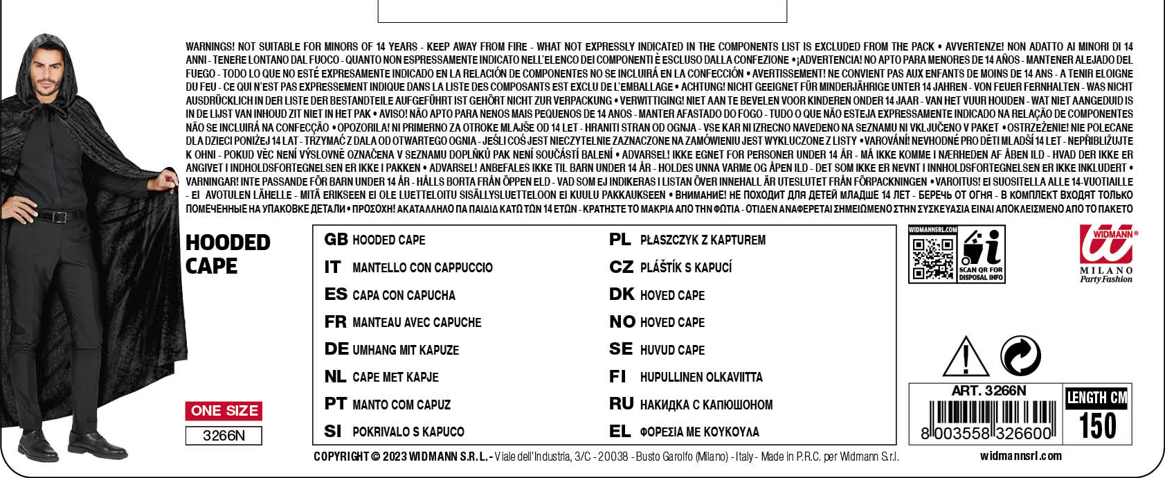 Mantello in velluto nero con cappuccio 150cm di lunghezza