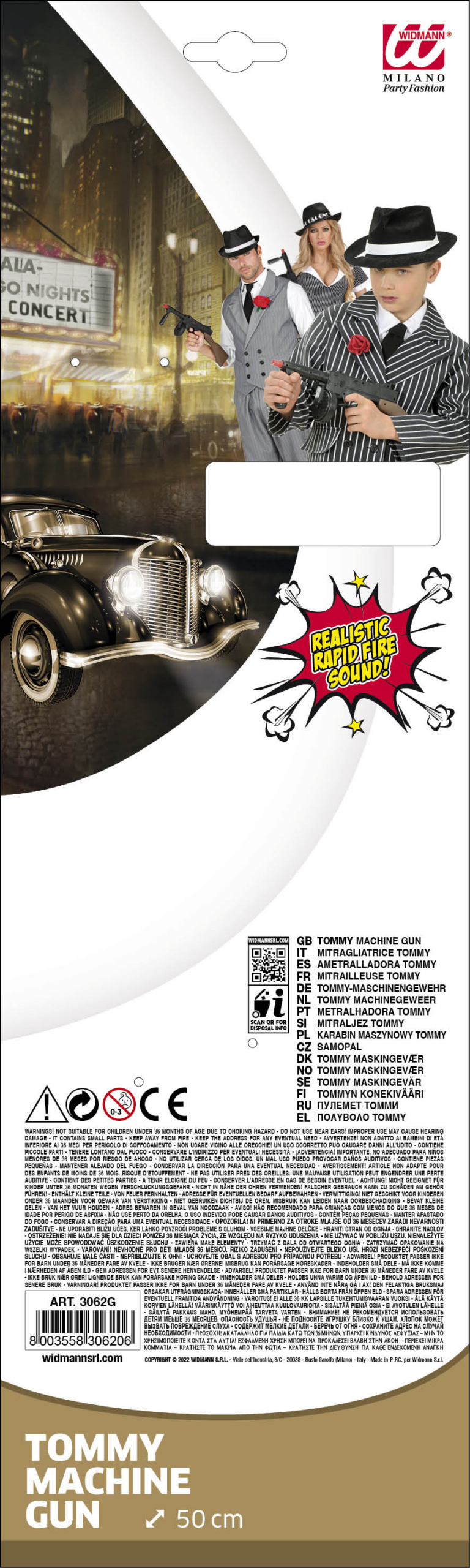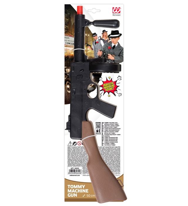 Ti manca ancora un accessorio adatto per un look perfetto come gangster, allora questa mitragliatrice è la cosa giusta. Il semplice fucile nero con fusto marrone (con venature del legno) non si adatta solo ai costumi dei gangster, ma anche ai soldati o simili. Premendo il pulsante di scatto si ottiene un suono realistico.