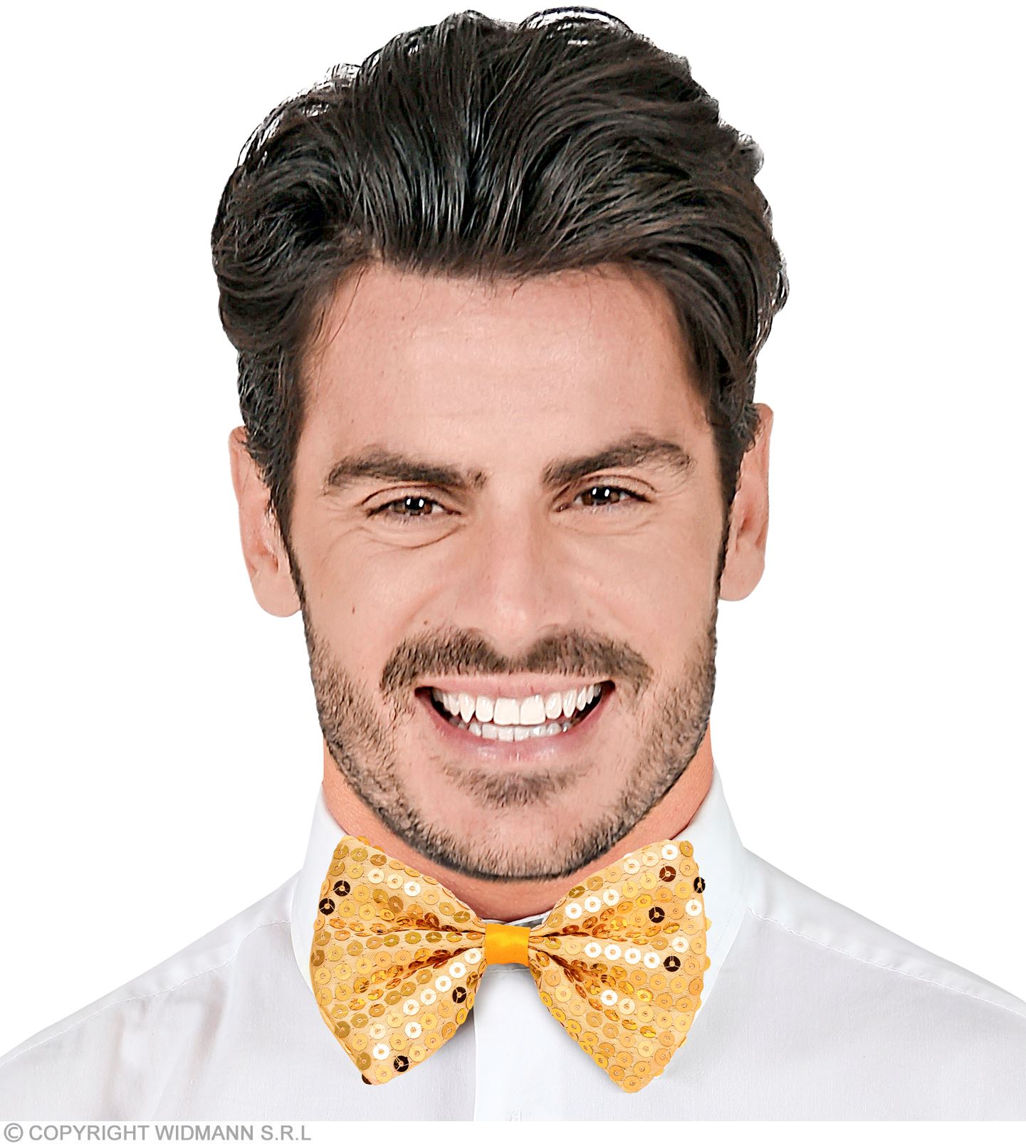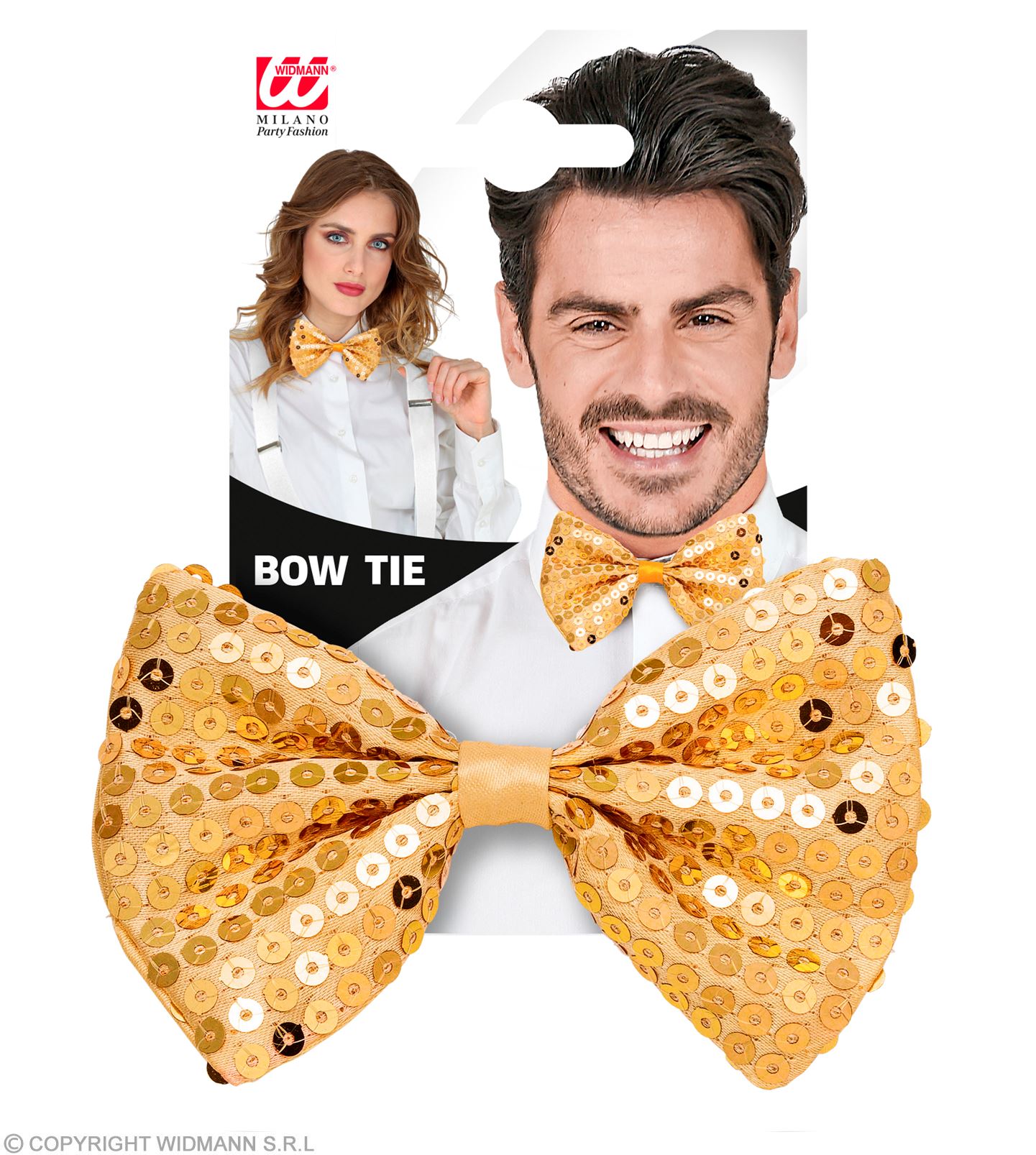 - Nella confezione è incluso un papillon decorato con paillettes dorate. Questi sono cuciti sul tessuto del papillon