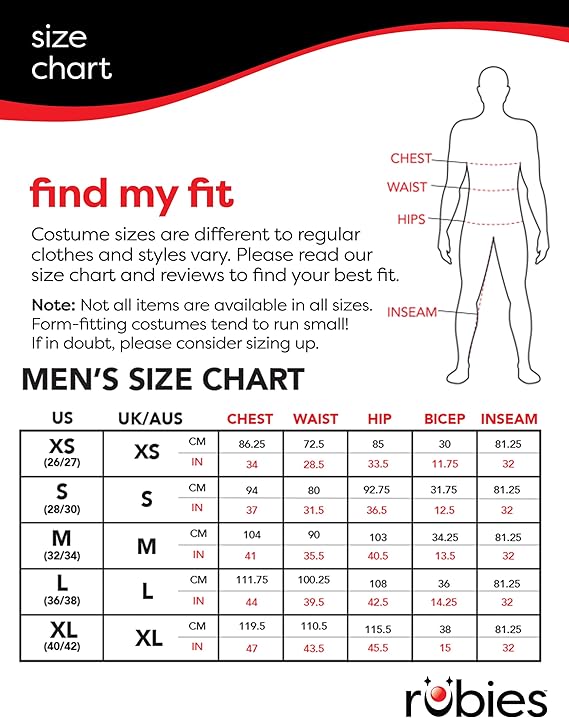- Importante: i costumi sono di dimensioni diverse rispetto ai vestiti e variano tra le marche, utilizzare la tabella delle taglie mostrata nelle immagini per fare la migliore selezione