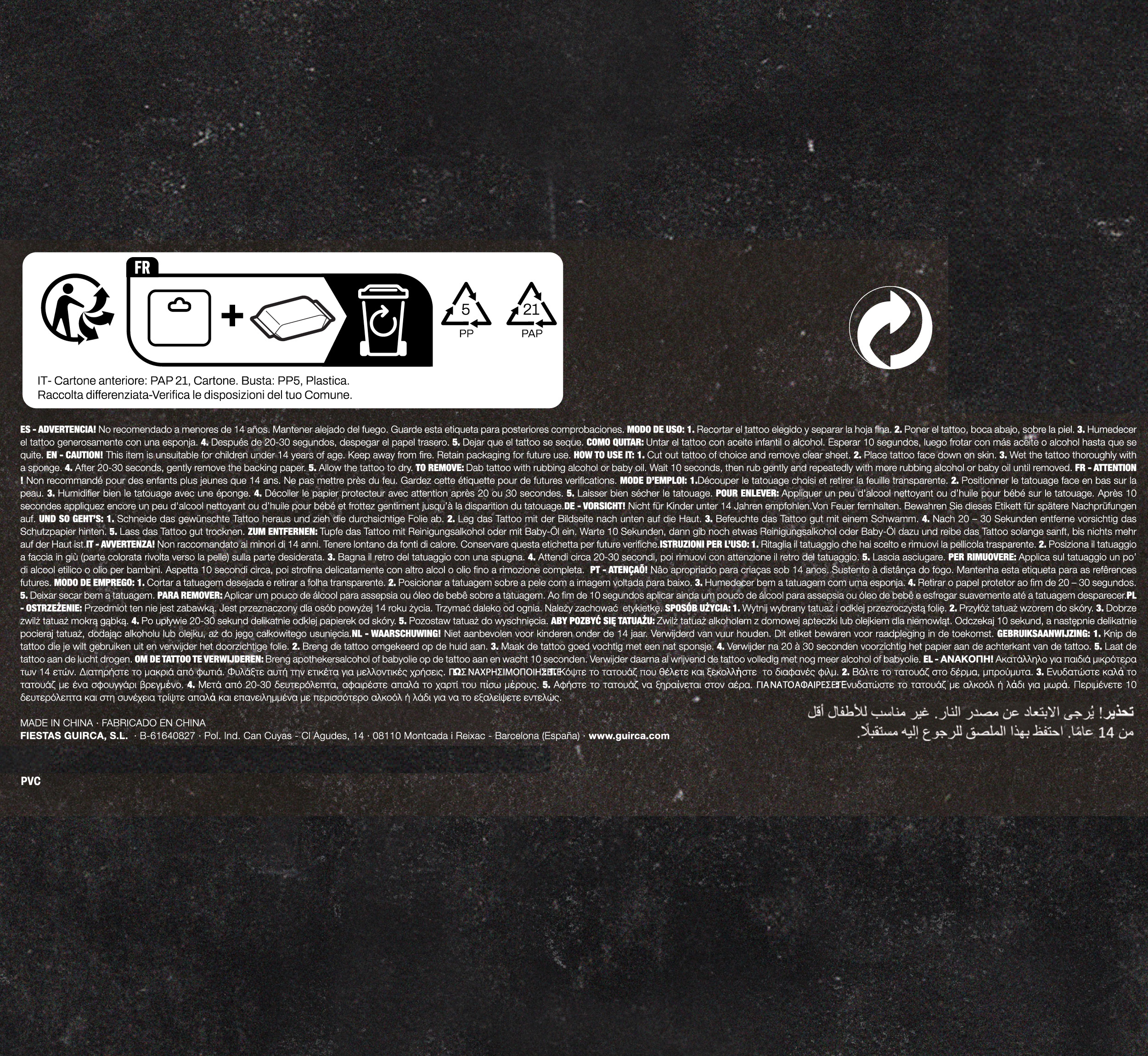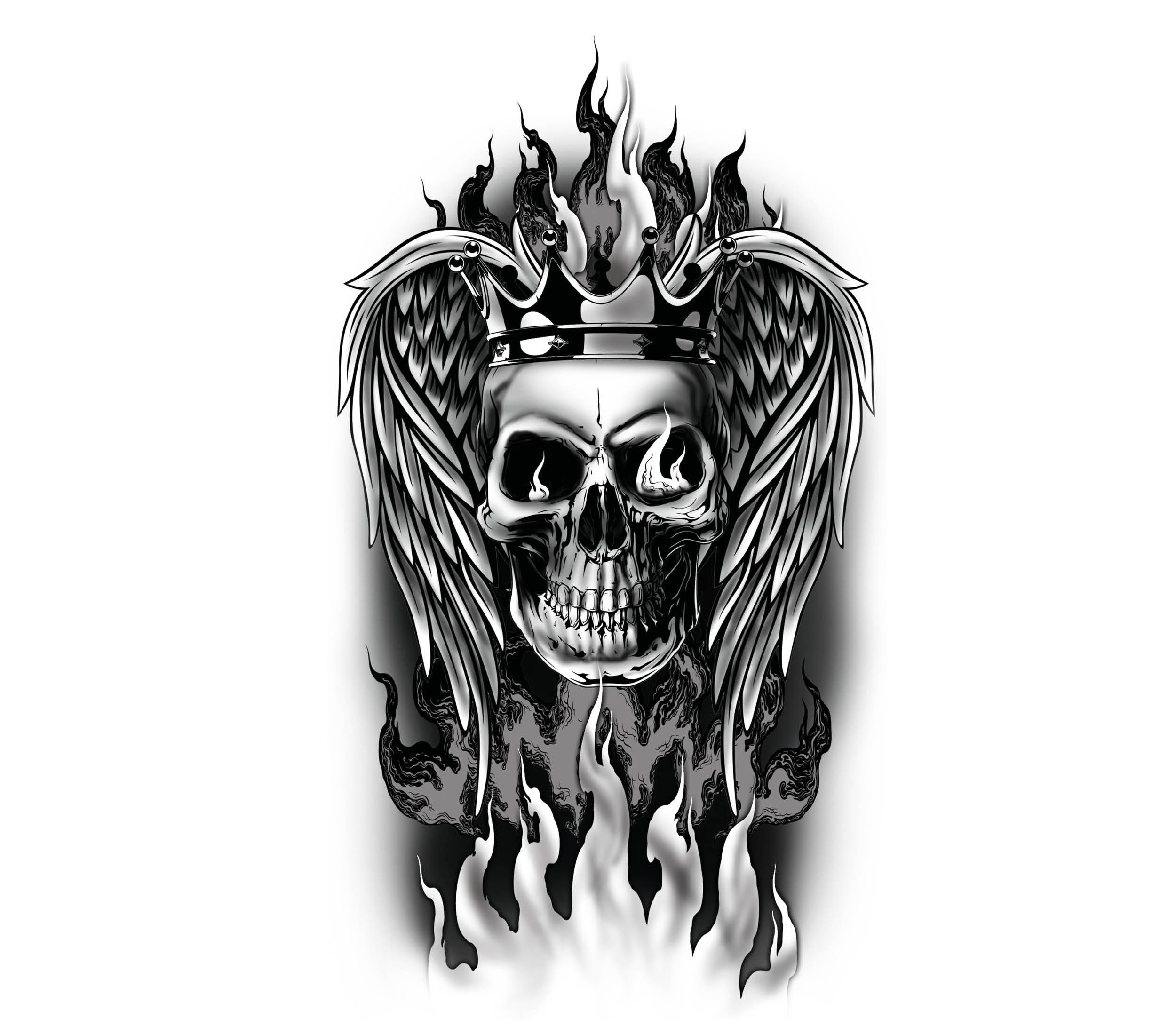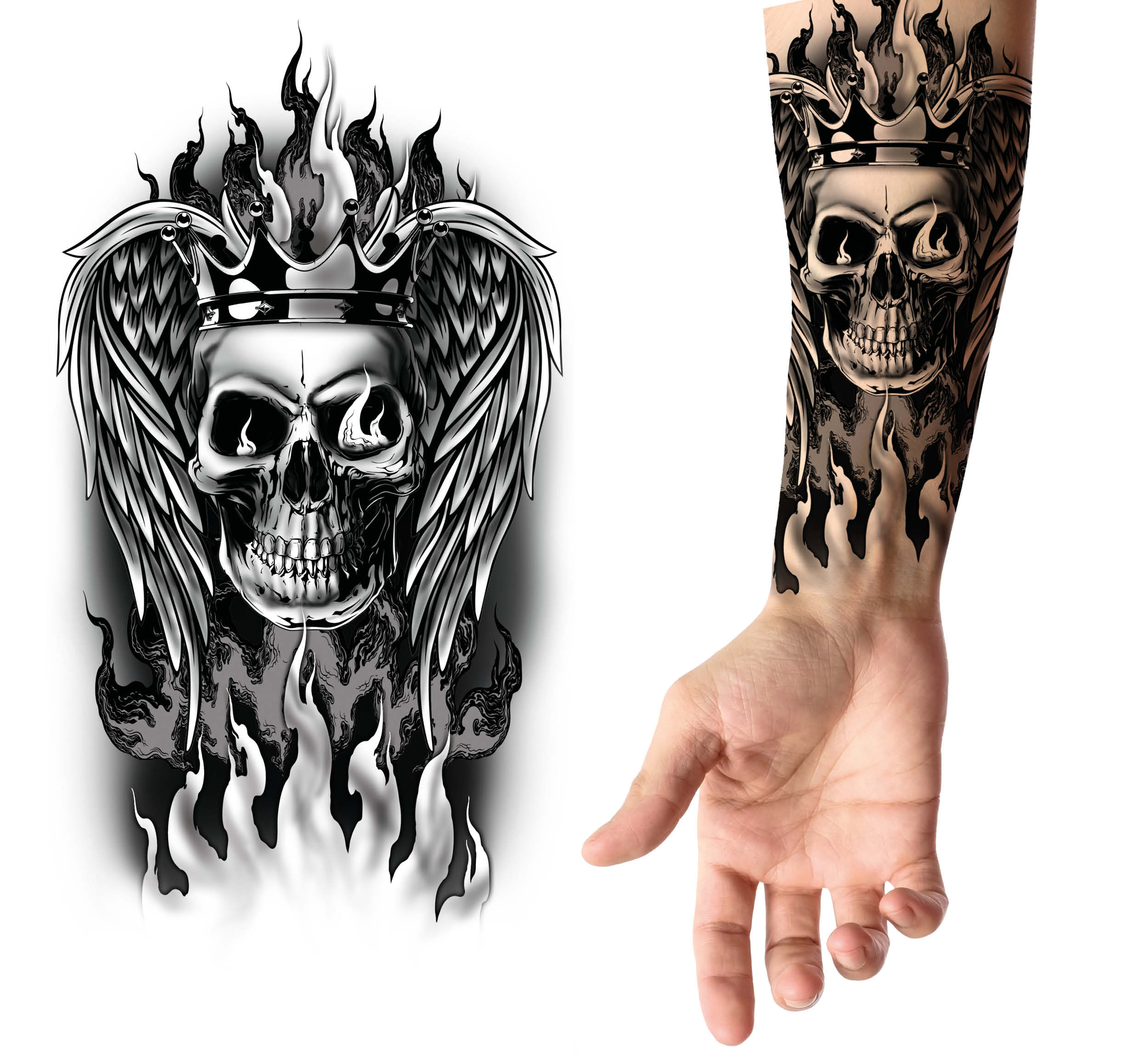 Tatuaggio teschio 14×30 cm per bracciaApplicare il tatuaggio seguendo le istruzioni standard per i tatuaggi temporanei: rimuovere la pellicola trasparente, posizionare il tatuaggio sulla pelle, inumidire con acqua e premere per 20-30 secondi prima di rimuovere la carta di supporto.