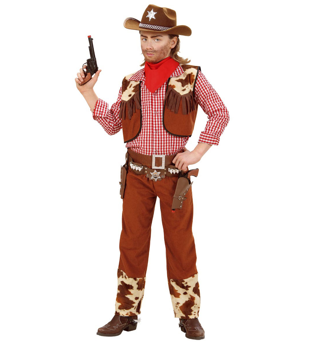 Costume COWBOY . La confezione comprende: (camicia, gilet, pantaloni, cintura, bandana). Sono esclusi gli altri accessori
