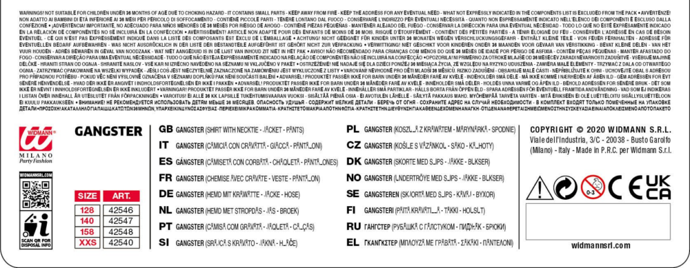 WIDMANN COSTUME GANGSTER . La confezione comprende: camicia con cravatta, giacca,pantaloni. Sono esclusi gli accessori non menzionati.Abito,Travestimento,Carnevale,Comico,Halloween,cosplay